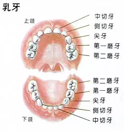 乳牙,人萌生的第一组牙,共20个,上、下颌各10 个。人的一生总共有两副牙列,第一副牙列称为乳牙列,是由20颗乳牙排列而成。从出生6个月左右开始萌出第一颗乳牙,到2岁半左右20颗乳牙萌出完毕。自6~7岁至12~13岁,乳牙逐渐脱落而被恒牙所替代。恒牙是继乳牙脱落后的第二副牙列,若因疾患或意外损伤而致脱落,再无牙替代。