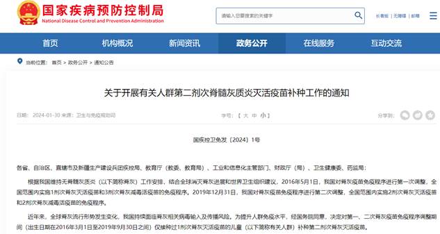 2024年1月,国家疾病预防控制局等6部门发布《关于开展有关人群第二剂脊髓灰质炎灭活疫苗补种工作的通知》。