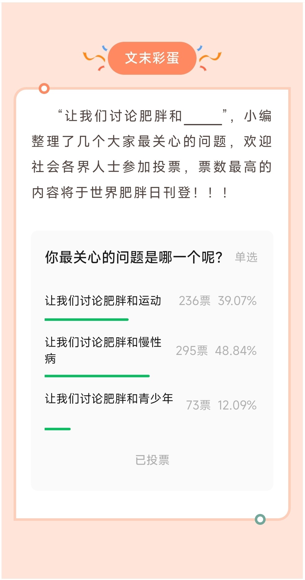 上期小编给各位推送了《世界肥胖日:“让我们讨论肥胖和______”》,经600余名社会各界人士投票,