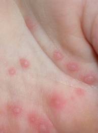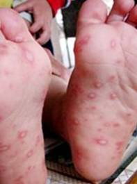 主要表现为发热,手、足、口、臀等部位出疹,可伴有咳嗽、流涕、食欲不振等症状。典型皮疹表现为斑丘疹、丘疹、疱疹。皮疹周围有炎性红晕,疱疹内液体较少,不疼不痒,皮疹恢复时不结痂、不留疤。某些型别肠道病毒如CV-A6和CV-A10所致皮损严重,皮疹可表现为大疱样改变,伴疼痛及痒感,且不限于手、足、口部位。