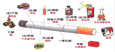 目前发现香烟烟雾中约有4500种化学物质,包括环芳烃,N⁃亚硝胺,重金属(镍,镉,铬和砷),生物碱(尼古丁及其主要代谢物,可替宁)和芳香胺等,可增加肺部、心血管疾病以及口腔、食道和膀胱等部位肿瘤疾病的发病风险。