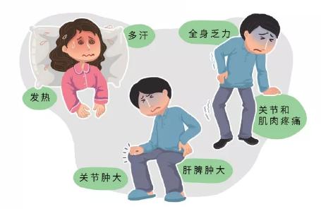 主要临床表现为发热、多汗、倦怠、乏力、关节痛等,部分男性病例会伴有睾丸炎,部分女性病例会出现卵巢炎。