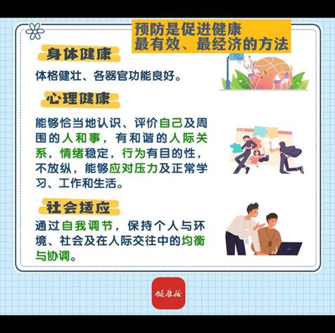 身体健康表现为体格强壮、各器官功能良好;心理健康是一种良好的心理状态,表现为能够恰当认识,评价自己及周围的人和事,有和谐的人际关系,情绪稳定,行为目的性,不放纵,能够应对压力及正常学习、工作和生活,对家庭和社会有所贡献;社会适应是指通过自我调节,保持个人与环境、社会及人际关系交往中的均衡与协调。国内外大量实践证明:坚持预防为主,养成文明健康生活方式,是预防传染病和慢性病的首选策略和措施,是促进健康最有效、最经济的手段。