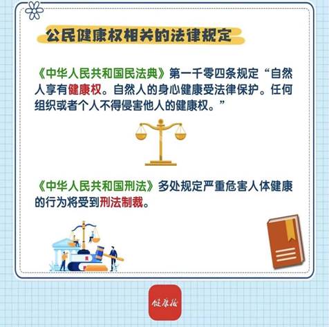 《中华人民共和国民法典》《中华人民共和国刑法》《中华人民共和国基本医疗卫生与健康促进法》等法律都对公民健康权进行了明确规定。
