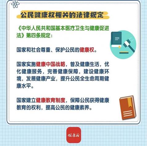 《中华人民共和国基本医疗卫生与健康促进法》第四条规定“国家和社会尊重、保护公民的健康权。国家实施健康中国战略,普及健康生活,优化健康服务,完善健康保障,建设健康环境,发展健康产业,提升公民全生命周期健康水平。国家建立健康教育制度,保障公民获得健康教育的权利,提高公民的健康素养。”
