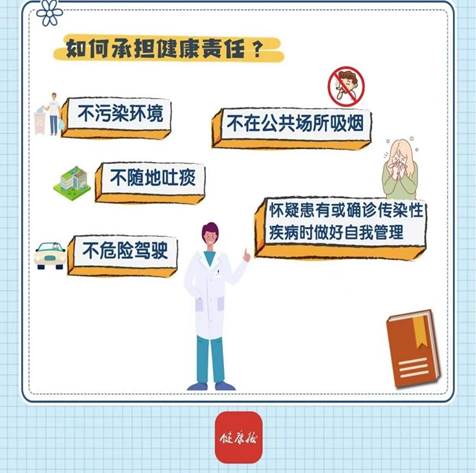 提高公众的健康水平,需要国家、社会和个人共同努力。每个人都有获取健康的权利,也有不损害他人健康的责任。不污染环境,不随地吐痰,不在公共场所吸烟,不危险驾驶,怀疑患有或确诊传染性疾病时做好自我管理等,都是承担健康责任、不损害他人健康的表现。