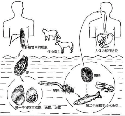 肝吸虫一般为淡水寄生虫,发育周期包括三个阶段,终宿主为人及肉食哺乳动物(狗、猫等),第一中间宿主为淡水螺类,第二中间宿主为淡水鱼、虾。人感染肝吸虫主要是通过食入含有肝吸虫囊蚴的第二宿主淡水鱼虾所致。
