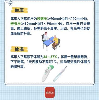 ●成年人正常腋下体温为 36~37℃,早晨略低,下午略高,1天内波动不超过1℃,运动或进食后体温会略微升高。体温高于正常范围称为发热,低于正常范围称为体温过低。