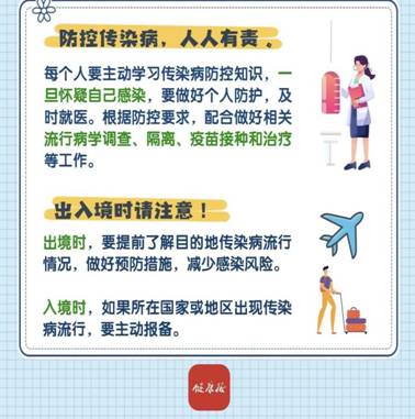 出境时,要提前了解目的地传染病流行情况,做好预防措施,减少感染风险;入境时,如果所在国家或地区出现传染病流行,要主动报备。单位和个人违反《中华人民共和国传染病防治法》规定,导致传染病传播、流行,给他人人身、财产造成损害的,应当依法承担民事责任。