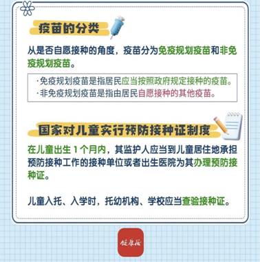 从是否自愿接种的角度,《中华人民共和国疫苗管理法》将疫苗分为免疫规划疫苗和非免疫规划疫苗。免疫规划疫苗是指居民应当按照政府规定接种的疫苗,包括:①国家免疫规划疫苗,即国家免疫规划确定的疫苗,现阶段国家免疫规划疫苗包括:乙肝疫苗、卡介苗、脊灰灭活疫苗、脊灰减毒活疫苗、百白破疫苗、白破疫苗、麻腮风疫苗、乙脑减毒活疫苗、乙脑灭活疫苗、A 群流脑多糖疫苗、A 群 C 群流脑多糖疫苗、甲肝减毒活疫苗、甲肝灭活疫苗等。②省、自治区、直辖市人民政府在执行国家免疫规划时增加的疫苗,即省、自治区、直辖市人民政府在执行国家免疫规划时,根据本行政区域疾病预防、控制需要增加的免疫规划疫苗种类。③县级以上人民政府或者其卫生健康主管部门组织的应急接种或者群体性预防接种所使用的疫苗。非免疫规划疫苗是指由居民自愿接种的其他疫苗。是否免费不是两类疫苗的区分标准。