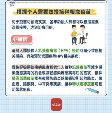 疫苗在保护人的全生命周期健康中发挥着重要作用。各个年龄阶段都可能面临病原微生物感染的风险。对于疫苗可预防疾病,各年龄段人群都可以根据需要选择接种,达到防病目的。例如,适龄人群接种人乳头瘤病毒(HPV)疫苗可减少致癌相关感染,有效预防宫颈癌等 HPV相关疾病;慢性呼吸系统疾病患者和老年人接种流感疫苗可减少感染流感病毒的机会或减轻感染流感病毒后的症状,接种肺炎球菌疫苗能有效预防肺炎球菌感染引起的肺炎、菌血症、脑膜炎、中耳炎等疾病;接种带状疱疹疫苗可预防带状疱疹。