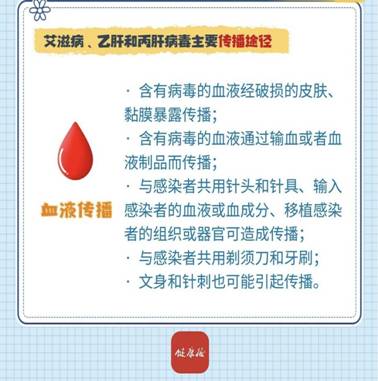 血液传播是指含有病毒的血液经破损的皮肤、黏膜暴露而传播,或含有病毒的血液通过输血或者血液制品而传播。与感染者共用针头和针具、输入感染者的血液或血成分、移植感染者的组织或器官可造成传播,与感染者共用剃须刀和牙刷、纹身和针刺也可能引起传播。