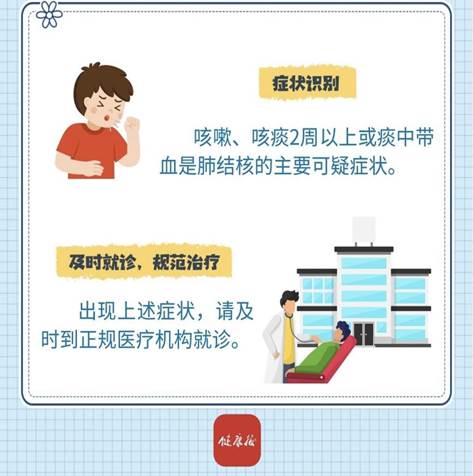 咳嗽、咳痰 2 周以上或痰中带血是肺结核的主要可疑症状,应及时到正规医疗机构就诊。早期诊断和规范治疗可以提高治愈率,减少或避免传染他人。肺结核可防可治,只要坚持规范治疗,绝大多数肺结核患者可以治愈。