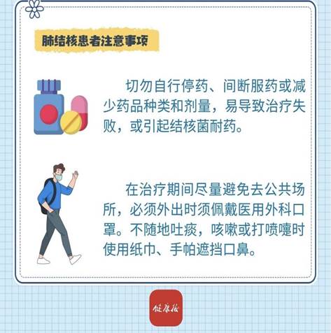 自行停药、间断服药或减少药品种类和剂量,不但容易导致治疗失败,还可能引起结核菌耐药。耐药结核病患者治疗时间更长、治疗费用更高,而且治愈率较低。肺结核患者在治疗期间应尽量避免去公共场所,必须外出时须佩戴医用外科口罩。做到不随地吐痰,咳嗽或打喷嚏时使用纸巾、手帕遮挡口鼻,可减少结核菌的传播。家庭中有传染性肺结核患者时应采取防护 措施,避免传染家人。与肺结核患者接触或出入结核病诊疗机构时,建议佩戴医用外科口罩。