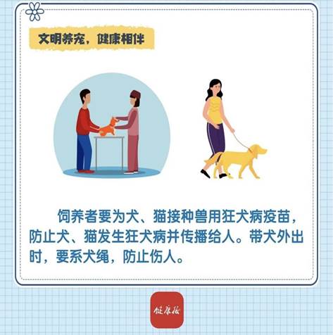 13. 家养犬、猫应接种兽用狂犬病疫苗;人被犬、猫抓伤、咬伤后,应立即冲洗、消毒伤口,并尽早注射狂犬病人免疫球蛋白(或血清或单克隆抗体)和人用狂犬病疫苗。