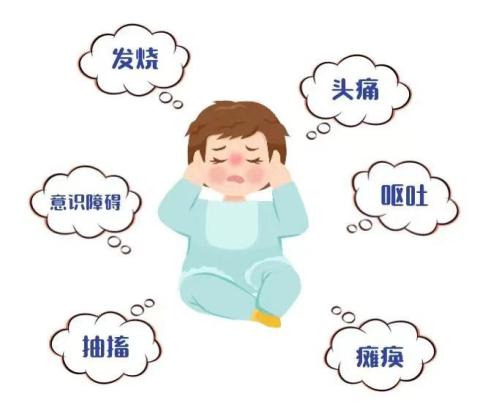 少数感染者出现中枢神经系统症状,临床分为轻型、普通型、重型和极重型(暴发型)。本病起病急,发热、头痛、喷射性呕吐,可出现不同程度的意识障碍,重型患者可出现全身抽搐、强制性痉挛或瘫痪等中枢神经症状,极重型病例出现脑疝、中枢性呼吸衰竭,病死率高。5%-20%的重型病例留有后遗症,主要有失语、肢体瘫痪、意识障碍、精神失常及痴呆等,经积极治疗后可有不同程度的恢复。癫痫后遗症有时可持续终身。