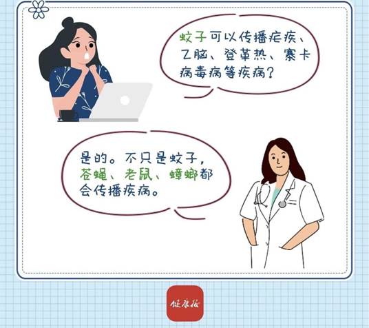 蚊子可以传播疟疾、乙脑、登革热、寨卡病毒病等疾病。保持环境卫生,消除蚊子孳生地。蚊幼虫生活在水中,要清理环境中的各类积水,无法清理的积水可定期投放杀蚊幼剂。根据情况选用纱门、纱窗、蚊帐、蚊香、杀虫剂、驱避剂等防蚊灭蚊用品,防止蚊子叮咬,预防蚊传疾病。