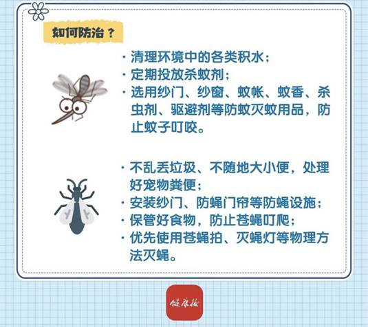 苍蝇可以传播霍乱、痢疾、伤寒等消化道疾病。搞好环境卫生,管理好垃圾、粪便、污物,消除苍蝇孳生地,可有效控制苍蝇数量。不乱丢垃圾、生活垃圾袋装化,不随地大小便、处理好宠物粪便等,可有效减少苍蝇孳生。安装纱门、纱窗、防蝇门帘等防蝇设施,切断侵入途径。保管好食物,防止苍蝇叮爬。优先使用苍蝇拍、灭蝇灯、粘蝇纸(带、绳)等物理方法灭蝇。