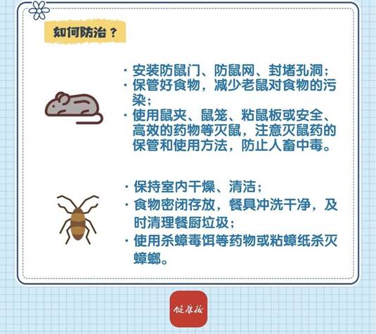 老鼠可以传播鼠疫、流行性出血热、钩端螺旋体病等多种疾病。搞好环境卫生,减少老鼠的藏身之地;安装防鼠门、防鼠网、封堵孔洞等。同时,保管好食物,减少老鼠对食物的污染。杀灭老鼠可以使用鼠夹、鼠笼、粘鼠板等捕鼠工具,还可使用安全、高效的药物灭鼠。要注意灭鼠药的保管和使用方法,防止人畜中毒。
