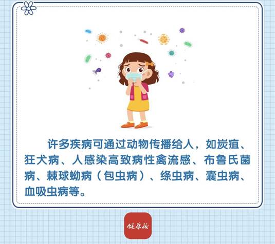 许多疾病可通过动物传播给人,如炭疽、狂犬病、人感染高致病性禽流感、布鲁氏菌病、棘球蚴病(包虫病)、绦虫病、囊虫病、血吸虫病等。