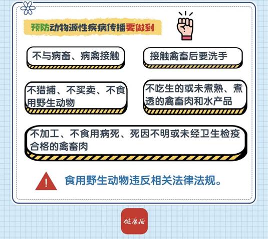 预防动物源性疾病传播,要做到:不与病畜、病禽接触;接触禽畜后要洗手;不加工、不食用病死、死因不明或未经卫生检疫合格的禽畜肉;不吃生的或未煮熟、煮透的禽畜肉和水产品;不猎捕、不买卖、不食用野生动物。食用野生动物违反相关法律法规。