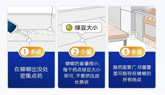 使用杀蟑胶饵要遵循少量、多点、全面的原则,否则无法达到“团灭”的效果。根据蟑螂的生活习性,建议的施药位置是:厨房、厕所、客厅的边角或缝隙。比如橱柜边角和顶背面、冰箱边侧与散热器出口处、空调管线入墙处、排气扇四周、洗手台镜子背面等。
