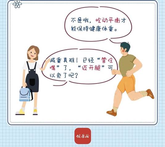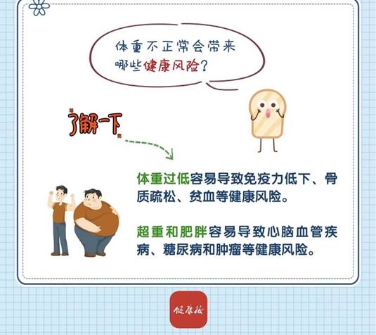 体重是否正常主要取决于能量摄入与消耗的平衡,即吃动平衡。进食量大而身体活动量不足,多余的能量就会在体内以脂肪的形式储存下来,造成超重或肥胖;相反,进食量不足或身体能量消耗大,可引起体重过低或消瘦。