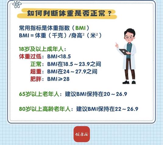 目前判断体重是否正常的常用指标是体重指数(BMI),BMI=体重(千克)/身高²(米²)。18 岁及以上成年人 BMI在18.5~23.9千克/米² 之间为正常,在 24~27.9 千克/米² 之间为超重,BMI≥28千克/米² 为肥胖,BMI<18.5 千克/米² 为体重过低。65岁以上老年人的适宜体重和BMI可略高,建议保持在 20~26.9千克/米²,80岁以上的高龄老年人BMI建议保持在22~26.9千克/米²。