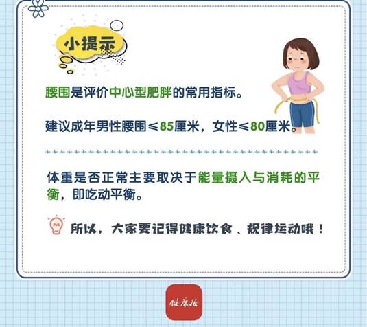 腰围是评价中心型肥胖的常用指标。建议成年男性腰围不超过85厘米,女性不超过80厘米。