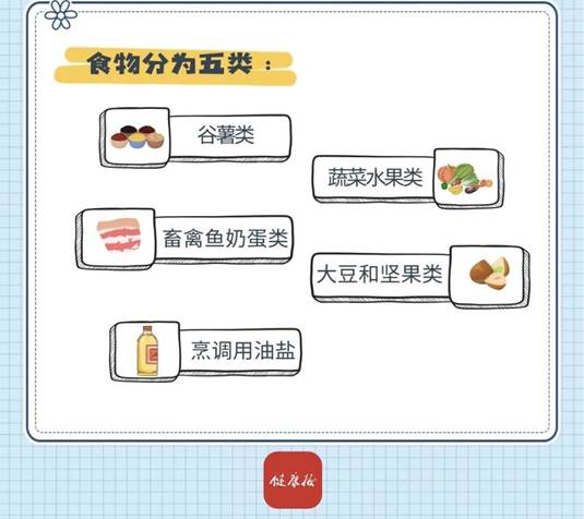 食物可以分为谷薯类,蔬菜水果类,畜禽鱼奶蛋类,大豆和坚果类以及烹调用油盐五类。多种食物组成的膳食才能满足人体对各种营养素的需求。建议平均每天摄入12种以上食物,每周摄入25种以上。通过同类食物互换、小份备餐以及荤素搭配、粗细搭配、蔬菜深浅搭配,实现食物多样化。