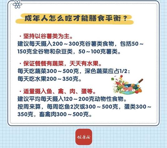 鱼、禽、肉、蛋等动物性食物富含优质蛋白质、脂肪、脂溶性维生素和矿物质等,应适量摄入。建议成年人平均每天摄入120~200克的动物性食物。可按周进行总量控制,相当于每周吃鱼2次或300~500克,蛋类300~350克,畜禽肉300~500克。