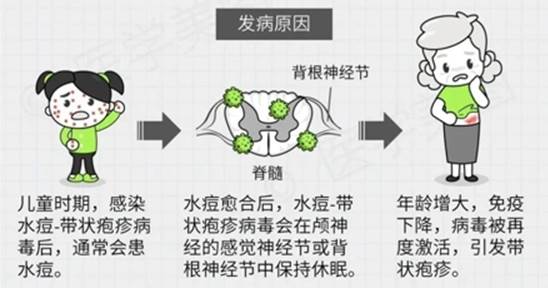 带状疱疹是潜伏于人体感觉神经节的水痘-带状疱疹病毒,经再激活后引起的皮肤损害。免疫功能低下者易发带状疱疹。临床特征为沿身体单侧体表神经分布的相应皮肤出现呈带状的成簇水泡,常伴有局部神经痛。