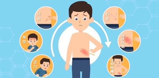 初期,可出现低热和全身不适。随后出现沿神经节段分布的局部皮肤灼痒、疼痛、感觉异常等。1-3天后沿着周围神经分布区域出现成簇的红色斑丘疹,很快发展为疱疹,沿神经支配的皮肤呈带状排列,故名“带状疱疹”。伴有显著的神经痛是该病突出特征。