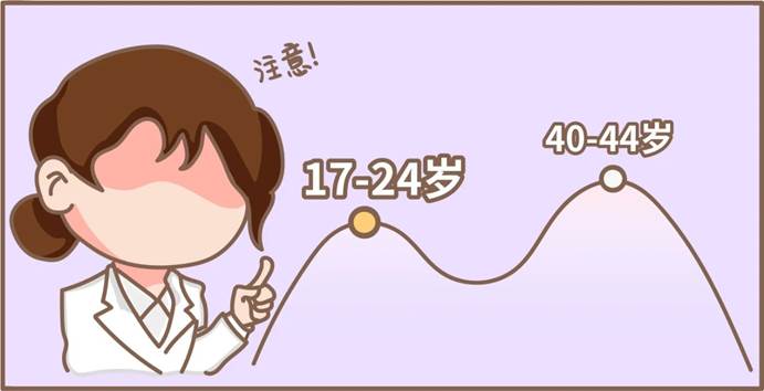 HPV感染呈现“两个高峰”:我国女性HPV感染随着年龄的增长呈现出“双峰”分布,两个高峰分别出现在“17-24岁”和“40-44岁”。重复的HPV病毒感染,在不知不觉中增加着我国女性子宫颈癌的发生风险。所以,不论是正处于学习工作期的女孩,还是正处于家庭事业期的女性都要在高峰来临前做好自我保护!