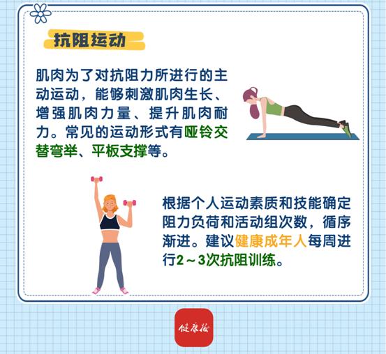 抗阻运动是指肌肉为了对抗阻力所进行的主动运动,能够刺激肌肉生长、增强肌肉力量、提升肌肉耐力。抗阻运动的阻力可来自他人、自身或健身器械,常见的运动形式有俯卧撑、平板支撑、哑铃交替弯举、弹力带站姿划船等。不同个体、不同身体部位的肌肉力量差异较大,可根据个人运动素质和技能确定阻力负荷和活动组次数,循序渐进。建议健康成年人每周进行 2~3 次抗阻训练。