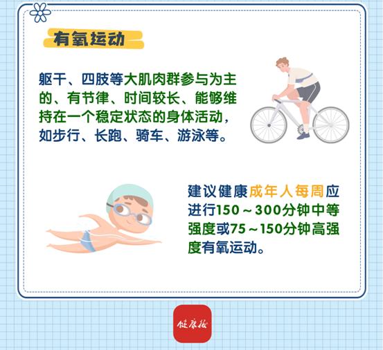 32.科学健身,贵在坚持。健康成年人每周应进行 150~300 分钟中等强度或 75~150 分钟高强度有氧运动,每周应进行 2~3 次抗阻训练。身体活动是指由于骨骼肌收缩产生的机体能量消耗增加的活动,包括职业活动、交通出行活动、家务活动、业余活动,其对健康的影响取决于活动的方式、强度、时间和频度。