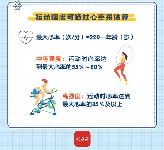运动强度可通过心率来估算。最大心率(次/分)=220-年龄(岁),运动时心率达到最大心率的 55%~80%,身体活动水平则达到了中等强度;运动时心率达到最大心率的 85%及以上,身体活动水平则达到了高强度。