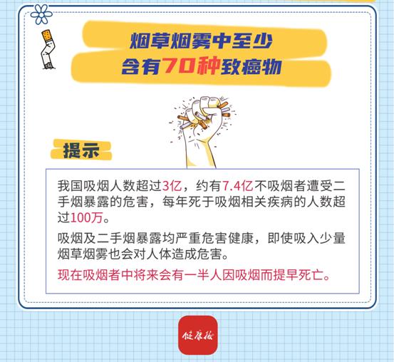 烟草烟雾中至少含有 70 种致癌物。吸烟及二手烟暴露均严重危害健康,即使吸入少量烟草烟雾也会对人体造成危害。