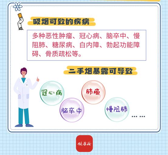 吸烟可导致多种恶性肿瘤、冠心病、脑卒中、慢阻肺、糖尿病、白内障、勃起功能障碍、骨质疏松等疾病。现在吸烟者中将来会有一半人因吸烟而提早死亡。二手烟暴露可导致冠心病、肺癌、脑卒中和慢阻肺等疾病。烟草烟雾中的有害物质可以通过胎盘进入胎儿体内,影响胎儿发育。孕妇暴露于二手烟可导致婴儿出生体重降低、唇腭裂等出生缺陷、 早产、流产以及婴儿猝死综合征等危害。儿童暴露于二手烟可增加发生支气管哮喘、急性中耳炎、呼吸道疾病等发病风险。