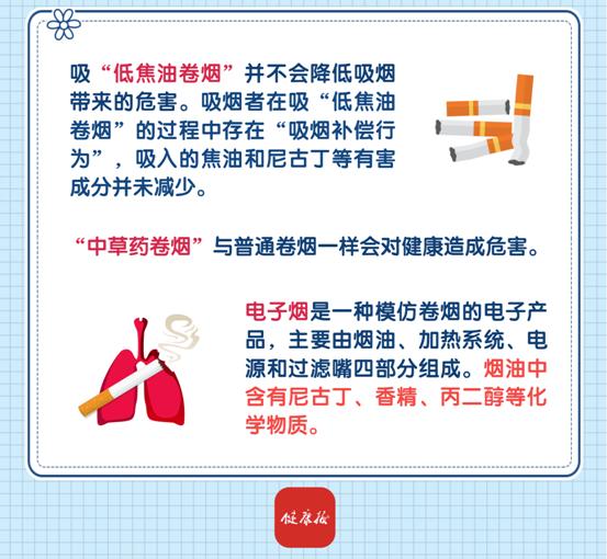 不存在无害的烟草制品,只要吸烟即有害健康。相比于普通卷烟,吸“低焦油卷烟”并不会降低吸烟带来的危害。这主要是因为吸烟者在吸“低焦油卷烟”的过程中存在“吸烟补偿行为”,包括用手指和嘴唇堵住滤嘴上的透气孔、加大吸入烟草烟雾量和增加吸卷烟支数等。“吸烟补偿行为”使吸烟者吸入的焦油和尼古丁等有害成分并未减少。“中草药卷烟”与普通卷烟一样会对健康造成危害。