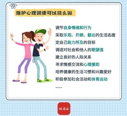 积极参加体育运动是维护心理健康的重要途径,运动可以增强正确面对挫折和困难的能力。通过运动可以使负面情绪得以合理地宣泄、释放,尤其是中等强度有氧运动在培养良好心理品质和加强心理韧性等方面均具有显著作用。