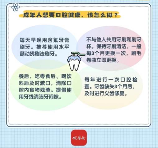 每天早晚用含氟牙膏刷牙,推荐成年人使用水平颤动拂刷法刷牙,儿童可以使用圆弧法刷牙。如佩戴活动假牙,应在每次饭后取出刷洗干净。餐后、吃零食后、喝饮料后要及时漱口,清除口腔内食物残渣。提倡使用牙线清洁牙间隙。