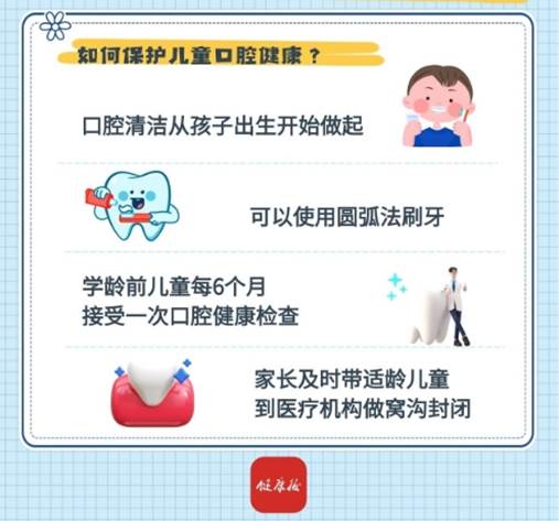 口腔清洁从孩子出生开始做起。家长应及时带适龄儿童到医疗机构做窝沟封闭。学龄前儿童每6个月接受一次口腔健康检查,发现口腔问题及时治疗。