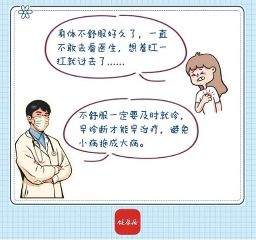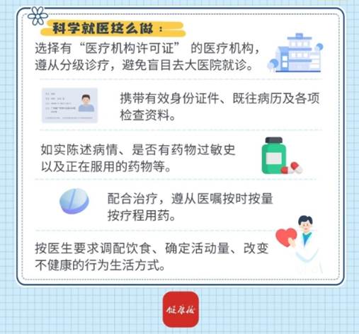 生病后要及时就诊,早诊断、早治疗,避免延误治疗的最佳时机,既可以减少疾病危害,还可以节约看病的花费。生病后要选择有“医疗机构许可证”的医疗机构就医。遵从分级诊疗,避免盲目去大医院就诊。就医时携带有效身份证件、既往病历及各项检查资料,如实向医生陈述病情、是否有药物过敏史以及正在服用的药物等,配合医生治疗,遵从医嘱按时按量按疗程用药。按照医生的要求调配饮食、确定活动量、改变不健康的行为生活方式。
