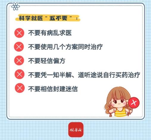不要有病乱求医,不要使用几个方案同时治疗,不要轻信偏方,不要凭一知半解、道听途说自行买药治疗,更不要相信封建迷信。