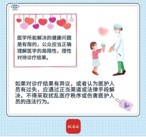 医学所能解决的健康问题是有限的,公众应当正确理解医学的局限性,理性对待诊疗结果,不要盲目地把疾病引发的不良后果和药品自身存在的不良反应简单归咎于医护人员的责任心和技术水平。如果对诊疗结果有异议,或者认为医护人员有过失,应通过正当渠道或法律手段解决,不得采取扰乱医疗秩序或伤害医护人员的违法行为。
