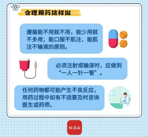 合理用药是指安全、有效、经济地使用药物。用药要遵循能不用就不用,能少用就不多用;能口服不肌注,能肌注不输液的原则。必须注射或输液时,应做到“一人一针一管”。任何药物都可能产生不良反应,用药过程中如有不适要及时咨询医生或药师。