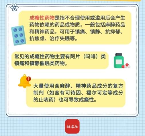 成瘾性药物是指不合理使用或滥用后会产生药物依赖的药品或物质,一般包括麻醉药品和精神药品,可用于镇痛、镇静、抗抑郁、抗焦虑、治疗失眠等。常见的成瘾性药物主要有阿片(吗啡)类镇痛和镇静催眠类药物。大量使用含麻醉、精神药品成分的复方制剂(如含有可待因、福尔可定等成分的止咳药)也可导致成瘾性。