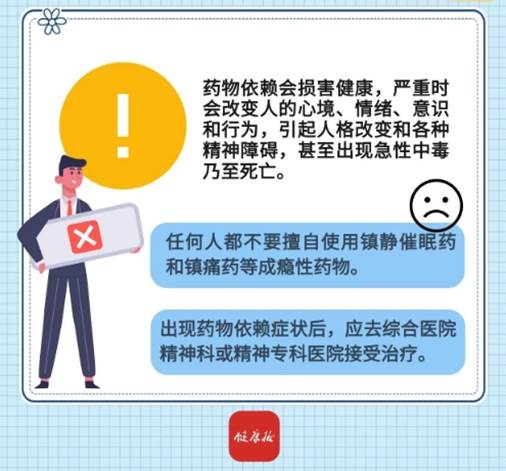 遵医嘱使用镇静催眠药和镇痛药等成瘾性药物,可以治疗或缓解病痛。不合理地长期、大量使用可导致药物依赖。药物依赖会损害健康,严重时会改变人的心境、情绪、意识和行为,引起人格改变和各种精神障碍,甚至出现急性中毒乃至死亡。因此,任何人都不要擅自使用镇静催眠药和镇痛药等成瘾性药物。