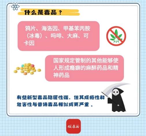 毒品是指鸦片、海洛因、甲基苯丙胺(冰毒)、吗啡、大麻、可卡因,以及国家规定管制的其他能够使人形成瘾癖的麻醉药品和精神药品。有些新型毒品隐匿性强,但其成瘾性和危害性与普通毒品相似或更严重。